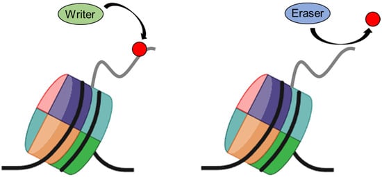 Histone modifying enzymes involved in chromatin regulation. The writer and eraser are groups of enzymes that act on histones; the writer adds small covalent modifications such as methyl and acetyl groups, while the eraser removes these modifications.