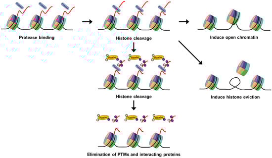 Histones are evicted from gene promoters during activation, facilitating access to the transcription machinery [,]. In S. cerevisiae, a histone H3 endopeptidase was identified, revealing that H3 cleavage precedes histone eviction. This cleavage potentially marks nucleosomes for displacement prior to gene induction, suggesting a role for histone tail cleavage in simplifying access for the transcription machinery during gene activation []. Collectively, the evidence suggests a connection between histone tail cleavage and the initiation of histone eviction. Histone tails undergo PTMs at different amino acids, playing a crucial role in chromatin remodeling, DNA accessibility, and overall chromatin dynamics. Two models describe the outcomes of histone tail modifications: changes in nucleosome physical properties leading to relaxed chromatin fibers and modifications serving as recognition marks for effector protein recruitment. First, histone tail modifications can induce changes in the physical properties of the nucleosome, reducing inter- or intra-nucleosomal contacts and resulting in a more relaxed chromatin fiber []. Specifically, histone acetylation neutralizes the positive charge of lysine, and histone phosphorylation introduces a negative charge, both of which contribute to chromatin decondensation. Second, these modifications serve as recognition marks that facilitate the recruitment of effector proteins [,]. Numerous chromatin-associated factors specifically interact with modified histones through various distinct domains, including the bromodomain, chromodomain, malignant brain tumor (MBT) domain, tudor domain, plant homeodomain (PHD) finger, and PWWP domain. Various chromatin-associated factors interact specifically with modified histones through distinct domains. Although specific modifications can be removed by enzymes, histone tail cleavage emerges as an efficient method to globally erase multiple modifications, thereby impeding the recruitment of effector proteins or halting other PTM cascades on histone tails. The radical removal of various modifications through histone tail cleavage thus adds complexity to the regulatory landscape of chromatin [,,,].