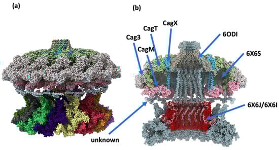 - Sheedlo, M.J.; Chung, J.M.; Sawhney, N.; Durie, C.L.; Cover, T.L.; Ohi, M.D.; Lacy, D.B. Cryo-em reveals species-specific components within the helicobacter pylori cag type iv secretion system core complex. eLife 2020, 9, e59495. [Google Scholar] [CrossRef]