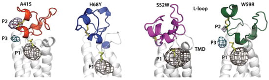 Botnari and Tchertanov have focused on human vitamin K epoxide reductase (hVKORC1), an endoplasmic reticulum (ER) protein that reduces inactive vitamin K 2,3-epoxide to active vitamin K quinone, i.e., a protein required for blood coagulation []. Structurally, hVKORC1 is a small modular protein with a transmembrane domain, an intrinsically disordered L-loop that projects into the ER, and highly flexible N- and C-terminals that float in the cytoplasm. Genetic polymorphisms of hVKORC1 are associated with low or accelerated rates of vitamin K recycling, leading to serious conditions such as bleeding and thrombosis. Surprisingly, the hVKORC1 polymorphism affects the response to doses of anti-vitamin K anticoagulants, promoting resistance to treatment. These studies follow previous studies made by the same group [,,]. They used a de novo model [] to perform MD simulations of the wild-type hVKORC1 and four different pathological mutants. All proteins have similar topology but different dynamics. L-loop missense mutations affect the folding and dynamic properties of the L-loop itself as well as the transmembrane domain. The extended ‘open’ conformation is either rarely observed (hVKORC1A41S and hVKORC1W59R) or never observed (hVKORC1S52W and hVKORC1H68Y). The compact globular conformation of the L-loop is mainly maintained by van der Waals contacts, specific for each mutant. These studies make it possible to define specific pockets during dynamics in each of these systems (see Figure 3) [].