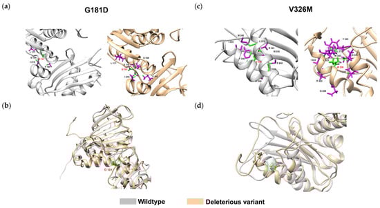 Structural change in MLH1 by G181D and V326M. (a) The wild-type G181 interacted with four residues (L177, S184, V185, and I219), whereas the variant D181 interacted with five residues (L177, E178, S184, V185, and I219). (b) The D181 caused instability of αG and further affected the MutS-HI domain. (c) The wild-typeV326 interacted with nine residues (F240, M242, L272, I322, N329, I330, S340, R341, and M342), and the M326 interacted with altered nine residues (L272, I322, L323, R325, Q328, I330, S340, M342, and Y343). (d) The M326 did not interact with the β sheet and caused the αI helix to detach. Grey: wild-type; peach: variant; green: interacting atoms; purple: non-interacting atoms; red label: wild-type and variants; black label: interacting residues (taken from []).