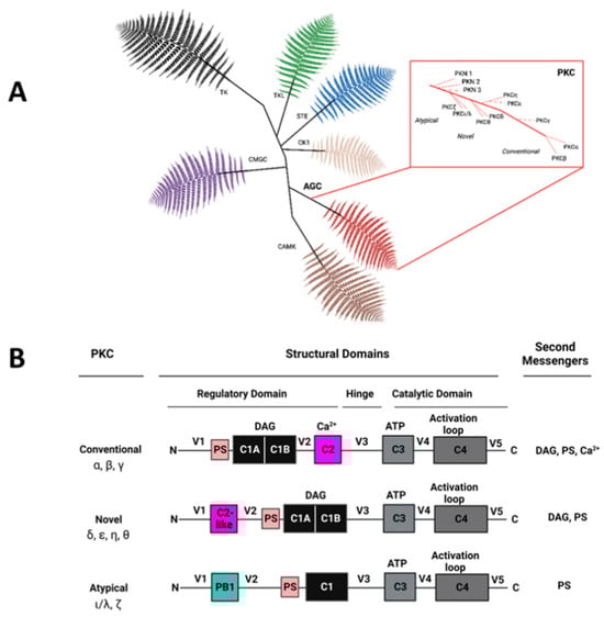 PKC isozyme diversity. (A) The human kinomephylogeny is extensive, and the PKC family is one member of the AGC superfamily (bottom right), with three groups of conventional, novel, and atypical PKC isozymes. (B) PKC isozymes are homologous but contain a distinct set of structural domains responsible for their diverse functions and interactions with second messengers and other binding partners. All PKC family members are constituted by four conserved domains (C1–C4) separated by a hinge region. The pseudo-substrate site (PS) keeps the protein in its inactive form. Second messengers are indicated on the right side of the picture (taken from []).