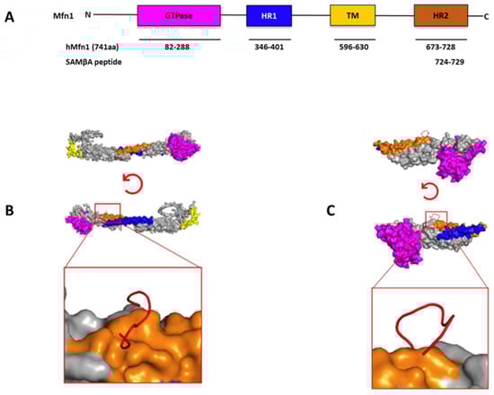 Structural domains of Mfn1 and peptides derived from substrate protein–protein interaction sites. A sequence corresponding to the homologous domain between PKCβII (P05771-2; residues 625–629) and Mfn1 (26251799; residues 724–729) was identified, and the SAMβA peptide corresponding to this sequence was developed. (A) The structural and functional domains of full-length mitofusin-1 (Mfn1) (741 AAs). The GTPase domain is shown in magenta, heptad repeat (HR1) coiled-coil regions 1 in blue, the transmembrane (TM) domain is shown in yellow, and heptad repeat (HR2) coiled-coil regions 2 in orange. (B) Molecular docking results for the interaction of SAMβA (RNAENFDRF) and Mfn1 to the available crystal structure (PDB: 5GO4 []) or (C) AlphaFold predicted model (Q8IWA4). To help stabilise the α-helix structure, amino acids were added at the C- and N-terminus of the peptide. Mfn1 is shown by cartoon representation coloured in (GTPase—magenta; HR1—blue; HR2—orange; and TM—yellow) and the peptide is shown in red cartoon structure. Based on the docking analysis, the peptide is docked to the HR2, which is source domain for its rational design (taken from []).