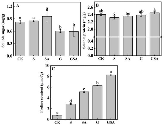 3.2. Effect of Graft, Exogenous SA, and Their Interaction on Osmotic Substances of Tomato under Salt Stress