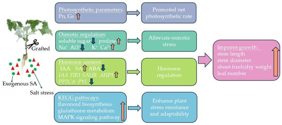 Miao, C.; Zhang, Y.; Cui, J.; Zhang, H.; Wang, H.; Jin, H.; Lu, P.; He, L.; Zhou, Q.; Yu, J.; et al. An Enhanced Interaction of Graft and Exogenous SA on Photosynthesis, Phytohormone, and Transcriptome Analysis in Tomato under Salinity Stress. Int. J. Mol. Sci. 2024, 25, 10799. https://doi.org/10.3390/ijms251910799