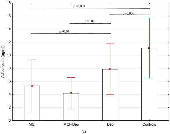 However, the data regarding the possible association between adiponectin levels in MCI subjects and cognitive decline and progress to dementia are conflicting. Similar to our results, Liu et al. found lower adiponectin levels in elderly MCI patients with T2DM compared to non-MCI diabetic and healthy controls [37]. The authors propose that age, lower education level, disease course of hypertension, disease course of diabetes, and a low adiponectin concentration may be risk factors for cognitive impairment. Another study also revealed lower levels of adiponectin and elevated CRP concentrations in adults with diabetes and cognitive impairment [38].