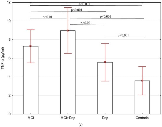 Serum levels of adiponectin (µg/mL) (a), hs-CRP (ng/mL) (b), and TNF-α (pg/mL) (c) in elderly patients with T2DM (MCI—mild cognitive impairment, Dep—depressive symptoms).