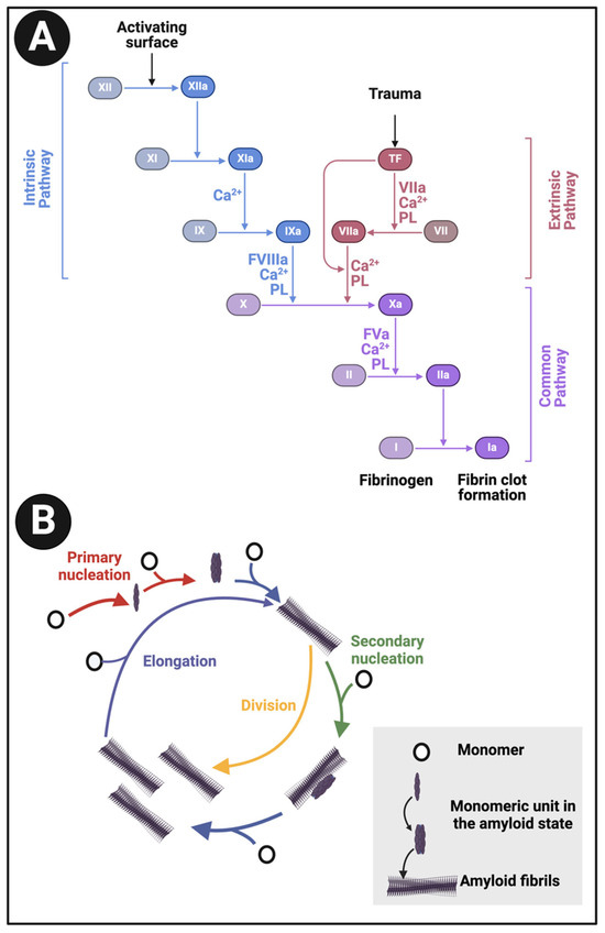 A given protein can even adopt various amyloid forms, known here as polymorphisms (e.g., [52,265,266,267,268,269,270,271,272,273,274,275,276,277,278]). The same is true of prions (e.g., [279,280,281,282,283]), arguably the most ‘extreme’ forms of amyloid(ogenic) proteins, and indeed the coinage of the term ‘prionoid’ (e.g., [284,285,286,287,288,289]) reflects this kind of overlap or continuum. In one sense [21], it is obvious that there must be parallels between the kinds of fibril formation that are seen in classical amyloidogenesis (commonly in the range 2–25 nm diameter [255,290,291,292,293]) and that seen in both normal and pathological blood clotting (although those fibrils are commonly at least 10x larger in diameter [198], see above), since in both cases fibrils are an observable result. Lengths of fibrils in classical amyloidoses can be 1 μm or so [294]. Consequently, in this section, we review what is known of amyloid fibril formation in the classical amyloidoses [255].