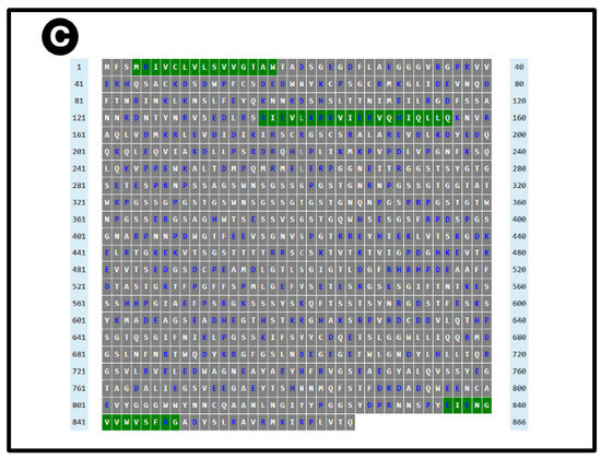 Prediction of amyloidogenic regions of (A) human prion protein and (B) fibrinogen α chain on AmyloGram [74,99], and (C) fibrinogen α chain on AnuPP [104]. In the latter case, amyloidogenic regions are shown in green. Blue columns indicate residue numbers.