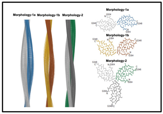Historically, establishing the structures of amyloid fibres formed even by single proteins or peptides was difficult because of their insoluble nature, but this is being changed by techniques such as solid-state NMR (e.g., [147,148,149,150,151]) and nowadays, in particular, cryoEM (e.g., [152,153,154,155,156,157]). These make it clear that amyloidogenic stretches of proteins can be responsible for cross-β fibril and fibre formation. An example is given in Figure 3, reproduced from an open-access paper [157].