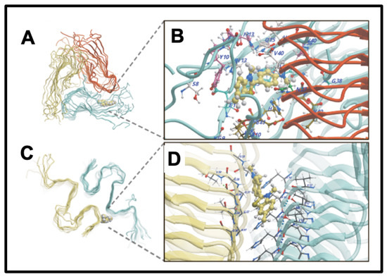A continuing and historically important discovery is the fact that the dye thioflavin T (ThT; https://pubchem.ncbi.nlm.nih.gov/compound/Thioflavin-T, accessed on 1 October 2024) binds to a whole series of amyloids, with a concomitant increase in its fluorescence [158]. This occurs because rotation of the normally rotatable single bond between the benzothiazole and dimethylaniline rings allows for fluorescence from an excited state to be dissipated and hence quenched. When the ThT is bound appropriately to a macromolecule, no such rotation is possible, fluorescence occurs, and thus ThT is a fluorogenic stain for amyloids (e.g., [159,160,161,162,163,164,165,166]). Note too that in the absence of amyloid target, ThT forms micelles with a critical micelle concentration of some 4 μM [159]. As phrased by Biancalana and Koide [161], “ThT binds to diverse fibrils, despite their distinct amino acid sequences, strongly suggesting that ThT recognizes a structural feature common among fibrils. Because amyloid fibrils share the cross-β architecture, it is generally accepted that the surfaces of cross-β structures form the ThT-binding sites”. Indeed, a number of such crystal structures have been solved, e.g., [167], or the relevant structures determined by other means (e.g., [168,169,170,171]), binding being seen as perpendicular to the cross-β elements and thus parallel to the fibrils themselves [52,147,169]. Figure 4 gives an example from an open-access publication [172].