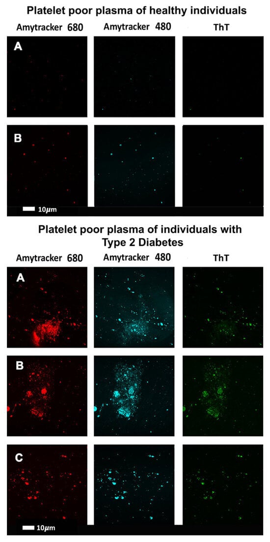 Confocal micrographs where thioflavin T (T) and Amytrackers were used to stain plasma from healthy participants (upper two rows) and those with type 2 diabetes (lower three rows) [196]. Stains used are as indicated.