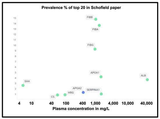 Prevalence of proteins (y-axis) in fibrinaloid microclots in the Schofield ‘top 20’ (green) and the one example also seen in the Kruger study (blue) versus average plasma concentrations that are taken from [378] except for TGFB1 [380] and periostin [381]. Abbreviations as in the list of abbreviations. The line of ‘best fit’ is not shown as it has a correlation coefficient r2 of only 0.1.