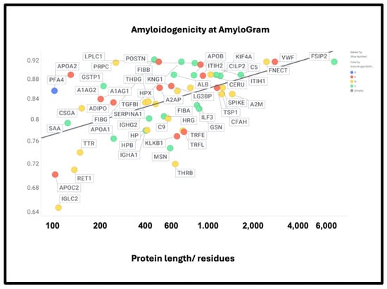 If axial or lateral co-aggregation is responsible for the ‘entrapment’ of proteins in fibrinaloid microclots, one would suppose that all the proteins involved would themselves be amyloidogenic. This can be tested using amyloidogenicity prediction programs of the type given in Table X. We chose AmyloGram [74], available at http://biongram.biotech.uni.wroc.pl/AmyloGram/ (accessed on 1 October 2024). For the proteins entrapped within microclots, we took the proteomics data from Table 2 from the long COVID study of Kruger and colleagues (who did not report on fibrinogen) and the Table 3 of the study of microclots in intensive care patients of Toh and colleagues [205]. The conclusion is very clear: every single one of the proteins detected in the microclots is highly amyloidogenic, and the microclots evidently involve cross-seeding. However, there was little correlation between amyloidogenicity and protein length (Figure 10) (r2 = 0.275). However, all but three of the Kruger proteins and all but four of the Schofield ‘top 20’ had an amyloidogenicity score exceeding 0.8 (Figure 10).