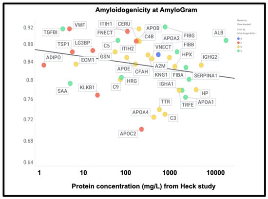 A chief source of protein abundances in plasma is [378]. In addition, we used other sources for high-abundance and other detected proteins including C9 [382,383], complement factor H [384], thyroxine-binding globulin [385], retinol-binding protein [386], TGFβ1 [380], periostin [381], CXCL7 (PFA4) [387], (pre)kallikrein [388], galectin-3-binding protein (LG3BP) [389], thrombospondin-1 [390], and ITIH1/2 [391]. LG3BP is of interest, as it is substantially lowered in the plasma of those with mild cognitive impairment or Alzheimer’s [392], arguably because it has been removed in amyloid microclots. Similarly, thrombospondin-1 also interacts with Aβ [393]. Reference [391] is very valuable in its own right, since while its coverage lacks some of the low-abundance proteins of interest here, it does list quantitative values for 197 plasma proteins; where both are available, the concentrations are well correlated (Figure 9) (slope = 1.06, r2 = 0.87), taking as the values for the Heck study [391] the averages of six data points for the controls of two patients at the first three time points. Consequently, we use the Heck dataset in most of what follows.
