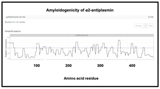 Amyloidogenicity of α-2-antiplasmin. The FASTA sequence was obtained from the Uniprot site given in Supplementary Table S1 and run on the Amylogram website http://biongram.biotech.uni.wroc.pl/AmyloGram/ (accessed on 1 October 2024) with the results as indicated.