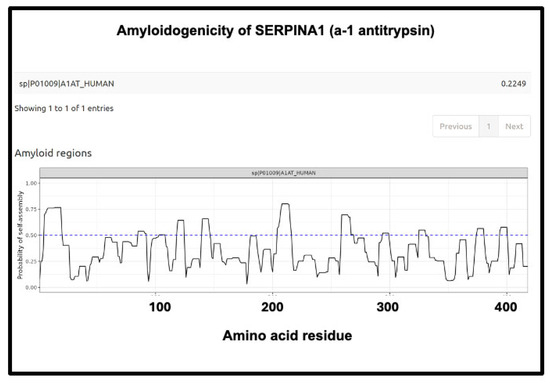 Amyloidogenicity of SERPINA1 (α1-antitrypsin). The FASTA sequence was obtained from the Uniprot site given in Supplementary Table S1 and run on the Amylogram website http://biongram.biotech.uni.wroc.pl/AmyloGram/ (accessed on 1 October 2024) with the results as indicated.