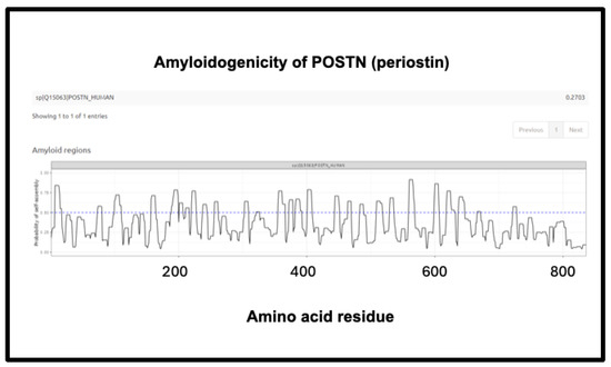 Amyloidogenicity of POSTN (periostin). The FASTA sequence was obtained from the Uniprot site given in Supplementary Table S1 and run on the Amylogram website http://biongram.biotech.uni.wroc.pl/AmyloGram/ (accessed on 1 October 2024) with the results as indicated.