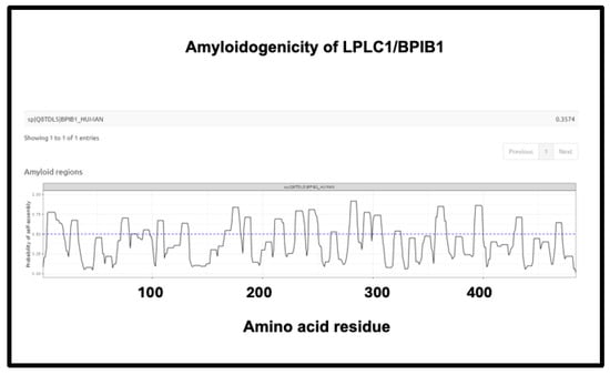 Amyloidogenicity of LPLC1/BPIB1. The FASTA sequence was obtained from the Uniprot site given in Supplementary Table S1 and run on the Amylogram website http://biongram.biotech.uni.wroc.pl/AmyloGram/ (accessed on 1 October 2024) with the results as indicated.