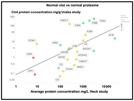 Undas and colleagues [438] provided (their Table 2) a quantitative list of protein-bound proteins in normal clots (that were presumably non-amyloid, though that was not in fact tested). Figure 16 compares the prevalence of proteins in their clots with that of plasma proteins, showing a reasonable correlation (slope = 0.67, r2 = 0.29) between the two. This contrasts with that for the fibrinaloid microclot proteome (Figure 7), where the value for r2 was just 0.1.