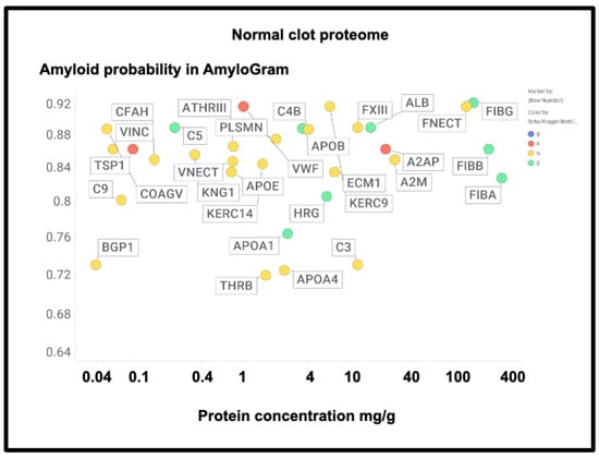 The presence of von Willebrand factor and adiponectin in the fibrinaloid microclots is very interesting, despite their comparatively low plasma concentrations (Figure 11). The former is among the most amyloidogenic proteins in the list (Figure 11) and is notably entrapped and removed by microclots in SARS-CoV-2 infection [405], while the latter is correlated with amyloid Aβ deposition [406] and may be protective [407]. LPLC1 (Figure 10, so low in concentration it does not appear in Figure 11; the human protein atlas https://www.proteinatlas.org/ENSG00000125999-BPIFB1/blood+protein (accessed on 1 October 2024 ) estimates its plasma concentration by mass spectrometry to be 2.7 μg/L) is also of interest. LPLC1 stands for “Long palate, lung and nasal epithelium carcinoma-associated protein 1” or also “BPI fold-containing family B member 1” (BNIB1), and to be clear, it is Uniprot Q8TDL5; again, it has a very high amyloidogenicity (~0.91). Finally, thrombospondin-1 is also very over-represented, and it too was neuroprotective against Aβ [393,408,409]. A clear pattern emerges.
