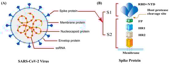 SARS-CoV-2 contains a single-stranded RNA-enveloped virus with a genome size of approximately 30 kb. The genome encompasses about 4 structural proteins, 16 non-structural proteins, and 5–8 accessory proteins []. The primary structural proteins comprise the spike protein (S protein), envelope protein (E protein), membrane protein (M protein), and nucleocapsid protein (N protein) (Figure 1). The full length of the S protein spans approximately 1273–1285 amino acids [], comprising two subunits: S1 and S2. The extracellular domain of the S1 subunit includes a conserved receptor-binding domain (RBD), facilitating the attachment of virus particles to the host receptor. The S2 subunit harbors a hydrophobic fusion peptide (FP) and two heptad repeat regions (HR1/2).