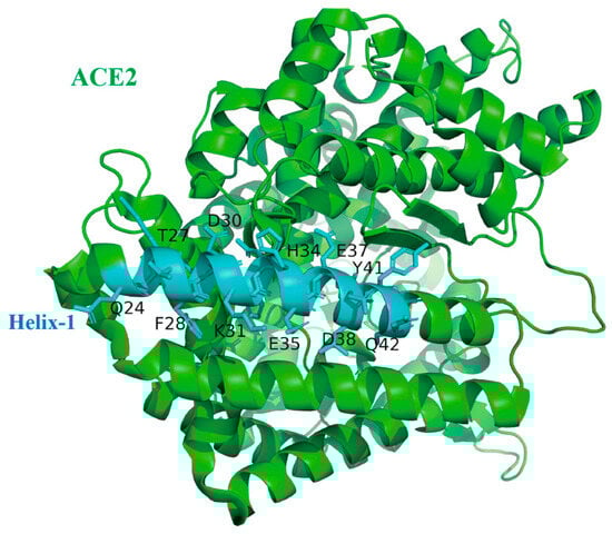 Structure of ACE2 (helix-1 in cyan, PBD ID:6M0J).