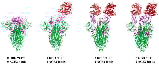 The S protein, serving as a pivotal apparatus for SARS-CoV-2 to infiltrate target cells, presents itself in a highly glycosylated homotrimeric configuration. Glycosylation plays a significant role in the appropriate folding of the S protein, its interaction with host proteinases, and its impact on the neutralizing efficacy of antibodies []. Under normal conditions, the states of the S protein RBD correspond to “up” (receptor-accessible or open) and “down” (receptor-inaccessible or closed) conformations (Figure 3).