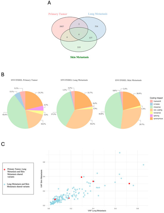Genomic Variant Signature. (A) The Venn plot shows common and unique variants among primary tumor, lung metastasis, and skin metastasis, marking overlaps. (B) The pie charts illustrate the total number of variants identified in the different samples, according to the coding impact. (C) The VAF plot shows the distribution of variant allele frequencies (VAFs) in primary tumor, lung metastasis and skin metastasis (red), and lung metastasis and skin metastasis (blue).