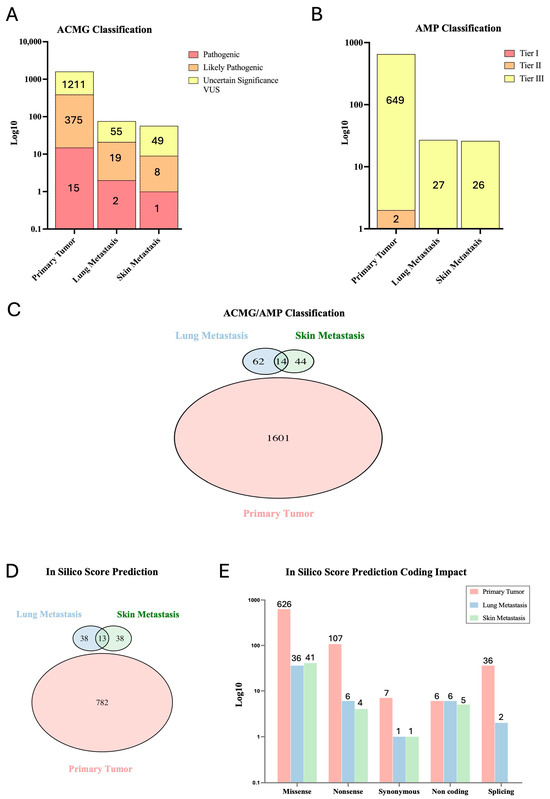 (A,B) The bar plots illustrate the number (log10-scaled) of candidate variants selected through the ACMG and AMP classification for the primary tumor, lung metastasis and skin metastasis. The selected variants are classified as pathogenic (red), likely pathogenic (orange) and uncertain significance (VUS in yellow) for ACMG, and Tier I (red), Tier II (orange) and Tier III (yellow) for AMP. The number within each bar represents the absolute number of the identified variants. (C) The Venn plot shows the distribution and intersection of unique and common variants between the primary tumor, lung metastasis, and skin metastasis, filtered for pathogenicity criteria ACMG/AMP. (D) In silico score prediction Venn plot of variants shared among the three samples and (E) bar plot of the total number (log10-scaled) of variants retained, with prediction score in the different samples according to the impact on the protein coding sequence. The number on the top of each bar represents the absolute count of variants.
