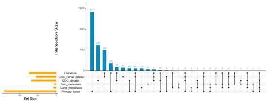 UpSetR graph. Visualization of intersections of the ACMG/AMP-based genes in primary tumor, lung metastasis, and skin metastasis samples with genes from the GDC-Data Portal, CBio-portal, and literature datasets [19,20,21,25,26,27,28,29]. It is important to note that UpsetR performs the intersection of all lists simultaneously. Therefore, the numbers obtained from pairwise comparisons may be lower, since genes common to more than two lists are not counted multiple times. This approach allows you to identify unique intersections between multiple datasets, providing a more complete view of the overlaps between different groups of genes, e.g., intersections between primary tumor and GDC are the sum of 49 (primary + GDC), 14 (primary + GDC + Lit), 4 (primary + GDC + Lit + CBio) and 1 (primary + metastasis + GDC), for a total of 68, as reported in the text. The list of literature genes is available in Supplementary Table S2.
