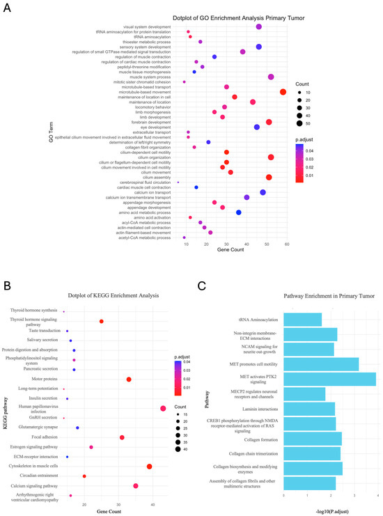 GO, KEGG and Reactome enrichment analysis of Primary Tumor sample. (A,B) Enriched GO-term dot plots. The size of the dots represents the number of genes in the significant gene list associated with the GO or KEGG terms. The color of the dots represents the adjusted p-values (Benjamini–Hochberg, BH). (C) Bar plots displaying the Reactome terms ordered by adjusted p-values (BH).