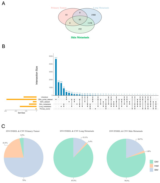(A) Venn plot shows the distribution and intersection of unique and common genes identified in CNVs among the primary tumor, lung metastasis, and skin metastasis. (B) UpSetR graph display the intersections of CNV-associated genes in the primary tumor, lung metastasis, and skin metastasis samples with the genes from the GDC-Data Portal, CBio-portal, and literature datasets [19,20,21,25,26,27,28,29]. (C) Pie charts illustrate the percentage of variants identified in the different samples, according to the molecular type.