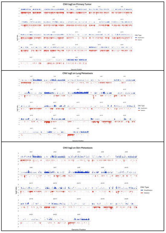 Finally, we performed the calling of CNVs using the CNVkit, with the aim of clarifying the profiles of the number of CNVs in the three samples. As shown in Figure 7, in the primary tumor, amplifications and deletions are distributed relatively uniformly throughout the genome, with a small number of regions showing significant variations in their copy numbers (thus, having a log2 ratio > 2 or <2). Instead, the metastases show a more pronounced presence of amplifications and deletions, suggesting greater genomic instability. In particular, some regions of the genome show extreme alterations in the number of copies, with log2 ratio values of about 3 and −3, indicating an increase in the chromosomal instability as the tumor progresses towards the metastatic phase.