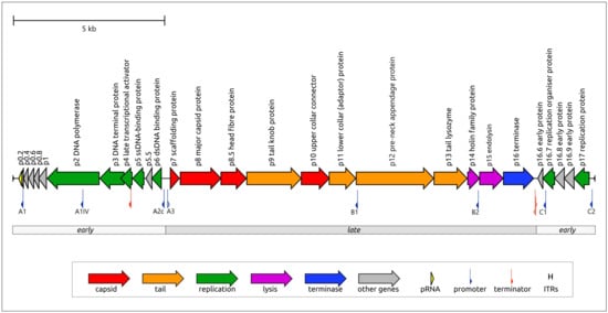 - Yoshikawa, H.; Ito, J. Terminal Proteins and Short Inverted Terminal Repeats of the Small Bacillus Bacteriophage Genomes. Proc. Natl. Acad. Sci. USA 1981, 78, 2596–2600. [Google Scholar] [CrossRef]