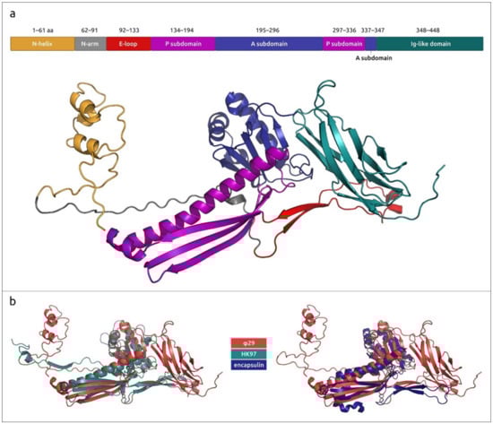 - Xiang, Y.; Morais, M.C.; Cohen, D.N.; Bowman, V.D.; Anderson, D.L.; Rossmann, M.G. Crystal and cryoEM Structural Studies of a Cell Wall Degrading Enzyme in the Bacteriophage Phi29 Tail. Proc. Natl. Acad. Sci. USA 2008, 105, 9552–9557. [Google Scholar] [CrossRef]