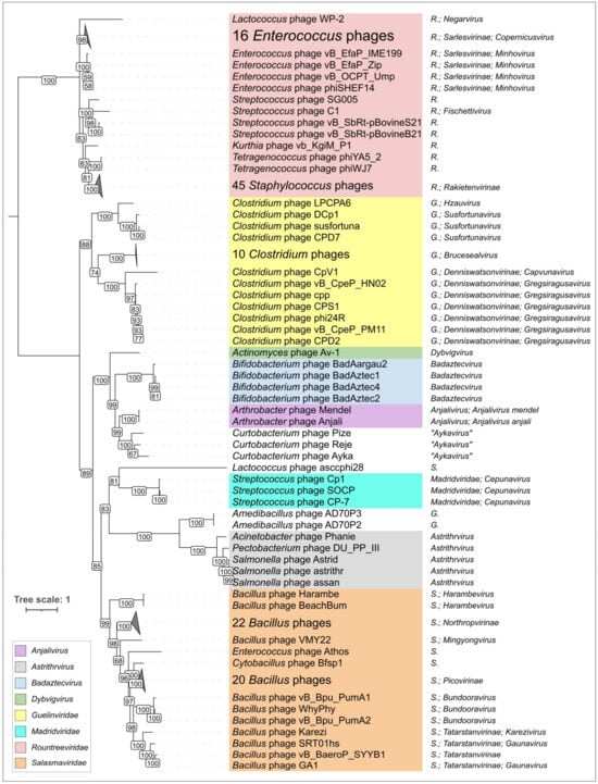 - Turner, D.; Kropinski, A.M.; Adriaenssens, E.M. A Roadmap for Genome-Based Phage Taxonomy. Viruses 2021, 13, 506. [Google Scholar] [CrossRef]