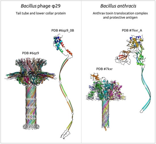 - Xiang, Y.; Rossmann, M.G. Structure of Bacteriophage Φ29 Head Fibers Has a Supercoiled Triple Repeating Helix-Turn-Helix Motif. Proc. Natl. Acad. Sci. USA 2011, 108, 4806–4810. [Google Scholar] [CrossRef] [PubMed]