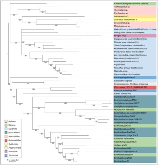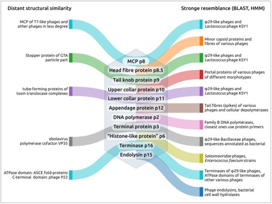 Evseev, P.; Gutnik, D.; Evpak, A.; Kasimova, A.; Miroshnikov, K. Origin, Evolution and Diversity of φ29-like Phages—Review and Bioinformatic Analysis. Int. J. Mol. Sci. 2024, 25, 10838. https://doi.org/10.3390/ijms251910838