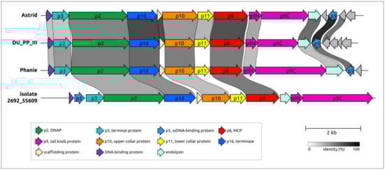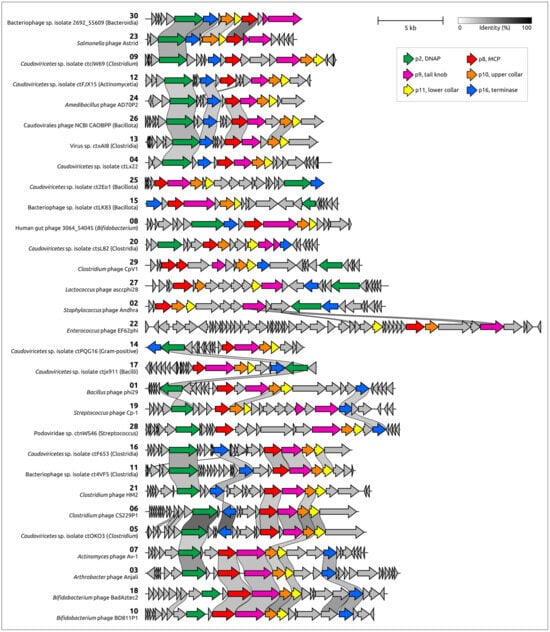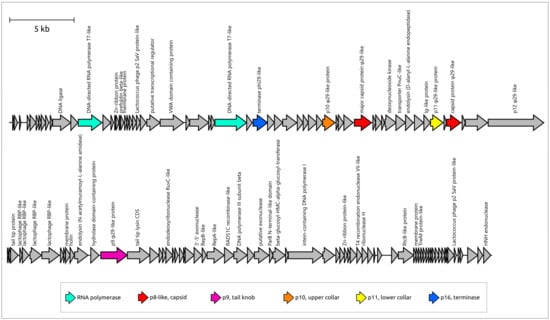 - Ismail, A.; Saini, T.; Al Qaffas, A.; Erill, I.; Caruso, S.M.; Temple, L.; Johnson, A.A. Evidence of a Set of Core-Function Genes in 16 Bacillus Podoviral Genomes with Considerable Genomic Diversity. Viruses 2023, 15, 276. [Google Scholar] [CrossRef] [PubMed]