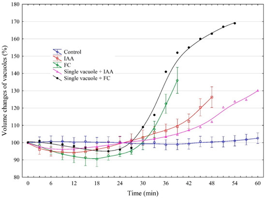 The results presented in this paper are considered in three aspects: first, the vacuole volume dynamics in the control medium (iso-osmotic solution) and in the presence of growth substances, auxin (IAA) and fusicoccin (FC) (Figure 1 and Figure 7). For our study, we chose FC, the phytotoxin produced by the fungus Fusicoccin amygdali Del., because it mimics the effects of auxin in many respects, although its mode of action at the molecular level differs from that of auxin [19,20,21,22]. The experiments presented here clearly show that practically no volume changes were observed when selected vacuoles were placed in the iso-osmotic solution (Figure 1). In accordance with the data obtained by [23], the volume of the beetroot vacuoles incubated in the iso-osmotic solution depends on the balance between the water and solute permeabilities. The authors also showed that beetroot vacuoles can hold its steady state in the pH range between 6.0 and 8.5, which is also confirmed by our experiments (here pH 7.5). However, when IAA or FC was present in the control medium, it increased the volume of the vacuoles to a level that was 26.4% or 36% higher than that observed in the control medium, respectively. Interestingly, in the presence of IAA, the time after which most of the vacuoles ruptured was, ca., 10 min longer than that for FC (Figure 1 and Figure 7).