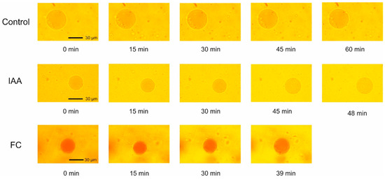 As the photographs indicate, in the presence of IAA, the time after which the most vacuoles ruptured was, ca., 10 min longer than that for FC.