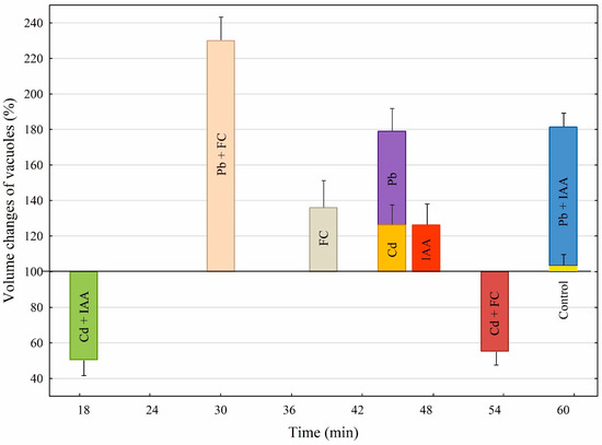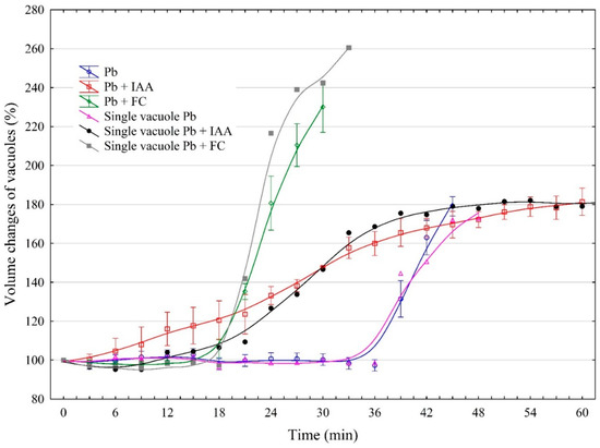 Figure 7 compares the volume changes of the vacuoles incubated in the presence of growth substances (IAA and FC) and heavy metals (Pb and Cd), as well as their combination. In addition, Figure 7 also shows the times after which the vacuoles ruptured at different variants of the experiments.