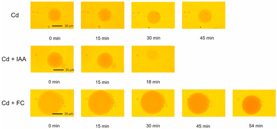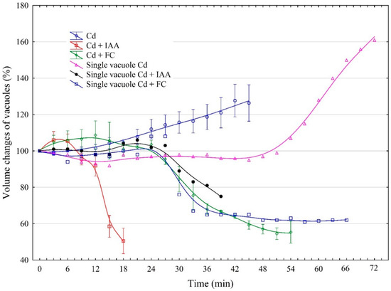 The addition of Cd at a final concentration of 100 µM (Figure 5) increased the volume of the vacuoles by, ca., 26% over 45 min. After this time, most vacuoles ruptured, although there was a case where the vacuole ruptured after 72 min (Figure 5). In this case, the volume of the vacuole started to increase after, ca., 54 min and reached a level that was 60% higher than that observed in the control medium. However, when IAA and Cd were added together, their effect differed from that when the substances were applied separately, and in this case, a rapid decrease in the vacuole volumes by about 50% was observed. Similarly to IAA, FC applied together with Cd decreased the volume of the vacuoles to a level comparable to that observed in the presence of IAA. Interestingly, the time after which the vacuoles ruptured was significantly shorter for vacuoles incubated in the presence of IAA and Cd added together than in the variant where FC was added together with Cd.
