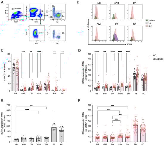 Distribution of peripheral blood B cell subsets and their surface expression of BCMA in 86 SLE patients under standard of care (SLE-SOC) and 30 HCs. (A) Dot plots illustrate the gating strategy of flow cytometry experiments. (B) Histograms show representative examples of BCMA expression in SLE, HC and isotype control (iso-ctr). (C) Frequencies of CD19+ B cell subsets, particularly IgD+CD27− naïve B cells (NB), Mitotracker+IgD+ activated naïve B cells (aNB), IgD−CD27− double-negative B cells (DN), IgD+CD27+ non-switched memory B cells (NSM), IgD−CD27+ switched memory B cells (SM), IgD−CD27highHLA-DRhigh plasmablasts (PB) and IgD−CD27highHLA-DRlow plasma cells (PC). (D) BCMA expression on B cell subsets. (E) Comparison of BCMA expression among different B cell subsets in HCs and (F) in SLE-SOC. Median values with interquartile ranges are presented. Comparison between HCs and SLE-SOC was performed using the Mann–Whitney test, and comparison of BCMA expression between different B cell subsets with Kruskal–Wallis test followed by Dunn’s post hoc test for multiple comparisons. ** p < 0.05; *** p < 0.001; **** p < 0.0001. MFI: median fluorescence intensity.