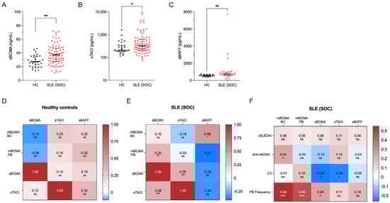 Soluble markers of the BAFF-APRIL system and their correlations in 30 healthy controls (HCs) and 86 SLE patients under standard of care (SLE-SOC). (A) Median values of soluble BCMA, (B) soluble TACI and (C) BAFF. (D) Heatmap of correlations between sBCMA, sTACI, sBAFF and BCMA expression on B cells (mBCMA BCs) in HCs, and (E) SLE-SOC patients. (F) Heatmap of correlations between BCMA expression on B cells (mBCMA BC), BCMA expression on plasmablasts (mBCMA PB), soluble BCMA, TACI and BAFF with clinical and serologic variables, particularly clinical SLEDAI-2K (cSLEDAI) scores, levels of anti-dsDNA antibodies (anti-dsDNA), complement 3 (C3) levels and plasmablast (PB) frequency. Median values with interquartile ranges are presented. Correlation analyses were performed using the Spearman ranked test, and the Spearman’s correlation coefficient (r) was calculated. ns, not significant. * p < 0.05; ** p < 0.01; *** p < 0.001; **** p < 0.0001.