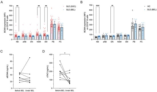 Effects of belimumab treatment on BCMA expression on B cell subsets. (A) BCMA expression levels on different B cell subsets in 86 SLE patients under standard of care (SLE-SOC) compared to 14 SLE patients under belimumab treatment (SLE-BEL). (B) BCMA expression on different B cell subsets in SLE-BEL patients compared to 30 HCs. (C) Levels of soluble BCMA (sBCMA) and (D) soluble TACI (sTACI) in a cohort of 9 SLE patients before and at a median of 8 months after initiating belimumab treatment. Median values with interquartile ranges are presented. The Mann–Whitney U test was performed to compare SLE-SOC with SLE-BEL and HCs. The Wilcoxon signed-rank test was used to compare sBCMA and sTACI before and during belimumab treatment. * p < 0.05; ** p < 0.01; **** p < 0.0001.