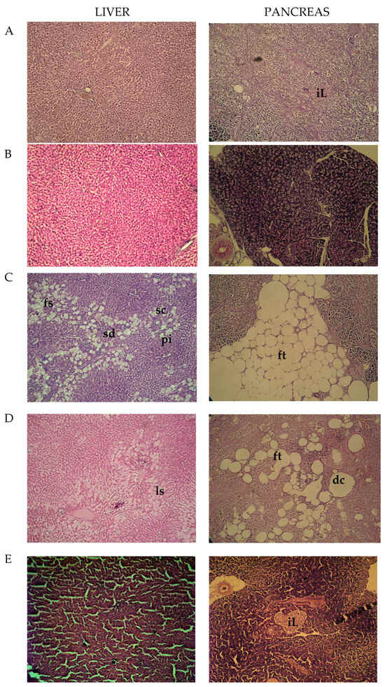 Histopathological photomicrographs of the liver and pancreas; (A)—control animals; (B)—rats treated with ECAhd: (C)—rats challenged with NA-STZ: (D)—diabetic rats, receiving acarbose; (E)—diabetic rats, treated with ECAhd for 28 days.