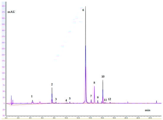 An UHPLC-DAD for the quantitative analysis of the C. alpina extract (ECA) main compounds was carried out. Generally, thirteen secondary metabolites, including five acyltartaric acids (ATAs) (1, 3, 4, 5, and 6), six acylquinic acids (AQAs) (2, 7, 9, 10, 11, and 12), and two flavones luteolin (13), and its O-glycoside (8) were identified in ECA. Based on the UV spectra and previous LC-HRMS data, compounds 3, 4, and 5 were categorized as ATAs, while 7 and 12 were categorized as AQAs [,]. A chromatogram at three different wavelengths (360 nm, 310 nm, and 280 nm) of ECA is depicted in Figure 2. The content of the assayed compounds is revealed in Table 4. Cichoric acid (6) was the major compound in ECA, followed by caftaric acid (1), chlorogenic acid (2), and 1,5-dicaffeoylquinic acid (10).