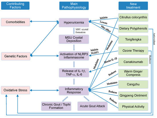 The exploration of novel treatment strategies for gouty arthritis in recent years has led to the introduction of several promising approaches aimed at overcoming the limitations of traditional therapies. These innovative treatments, including canakinumab [21,22,23], Citrullus colocynthis [34,35,36,37], and ozone therapy [40,41,42,43], exhibit unique mechanisms of action and potentially more favorable safety profiles. Canakinumab, an IL-1β inhibitor, has demonstrated significant efficacy in reducing inflammation and preventing acute gout flares, particularly in patients who are intolerant to conventional medications [21,22,23]. Similarly, natural therapies such as Citrullus colocynthis and ozone therapy provide nonpharmacological alternatives that may reduce reliance on conventional drugs, thereby minimizing the risk of adverse effects [34,35,36,37,40,41,42,43]. Incorporating these novel therapies into clinical practice could substantially improve patient outcomes by addressing both urate-lowering and anti-inflammatory needs. In addition to these novel therapies, integrating food polyphenols [52,53,54,55,56,57], traditional Chinese and Tibetan medicines [24,25,26,27,28,29,30], and complementary approaches such as warm ginger compresses [31,32,33] and regular physical activity [44,45,46,47] offers a more holistic approach to gout management. These natural treatments are generally well-tolerated, with minimal side effects, rendering them suitable for long-term use in managing gouty arthritis. For example, polyphenol-rich foods such as cherries and berries have been demonstrated to reduce serum urate levels and reduce the frequency of gout flares [55,56], whereas traditional medicines and therapies help alleviate pain and inflammation, thereby promoting overall health and well-being [24,25,26,27,28,29,30].